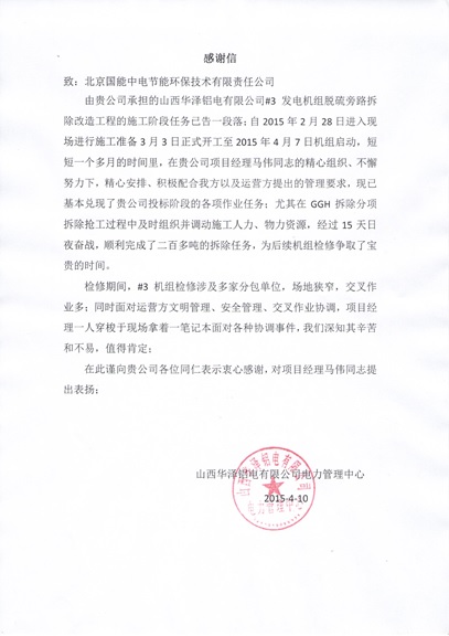 山西華澤鋁電旁路改造EPC項目受業(yè)主表揚(yáng)